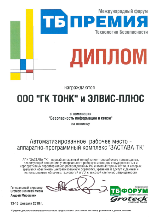 АПК "ЗАСТАВА-ТК" - лауреат Премии Форума «Технологии безопасности-2018»