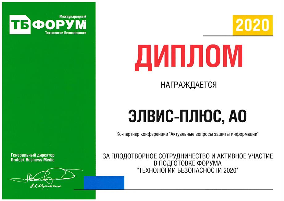 ЭЛВИС-ПЛЮС награжден дипломом форума "Технологии безопасности 2020"