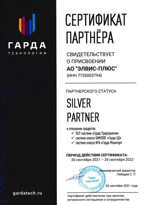 Компания Гарда технологии повысила партнерский статус ЭЛВИС-ПЛЮС до уровня Silver Partner. Статус присвоен до конца сентября 2022 года и относится к продуктам DLP-системы "Гарда Предприятие", системе класса NTA "Гарда Монгитор", а также системе класса DAM/DBF "Гарда БД".