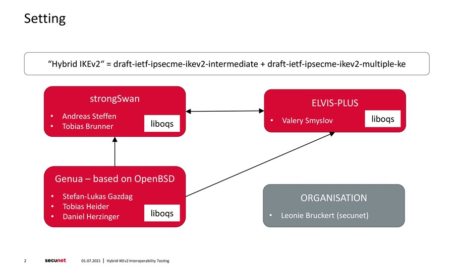 Третья презентация была информационным докладом о недавнем тестировании на совместимость существующих на сегодняшний день реализаций расширения Multiple Key Exchanges in IKEv2, в котором принимали участие ЭЛВИС-ПЛЮС (Россия), Genua (Германия) и некоммерческий open source проект strongSwan.