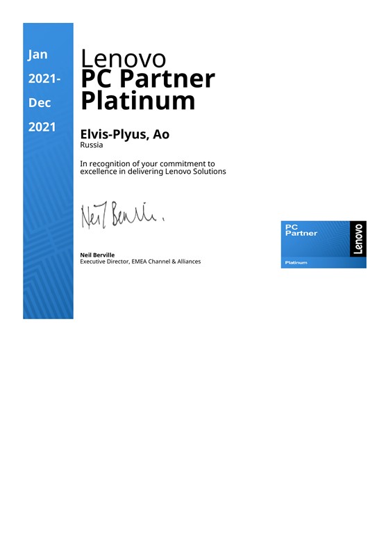 В 2021 году ЭЛВИС-ПЛЮС получил наивысший – Платиновый статус в партнерской программе Lenovo, подтвердив компетенции и профессионализм сертифицированных специалистов компании и продемонстрировав значительный объем продаж.