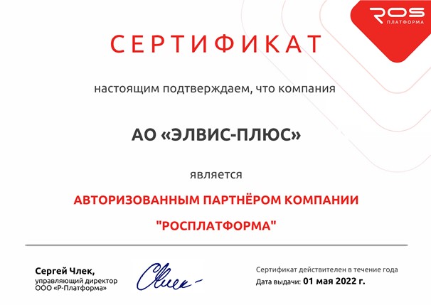 АО "ЭЛВИС-ПЛЮС" получило статус авторизованного партнера компании РосПлатформа, что подтверждено соответствующим сертификатом.